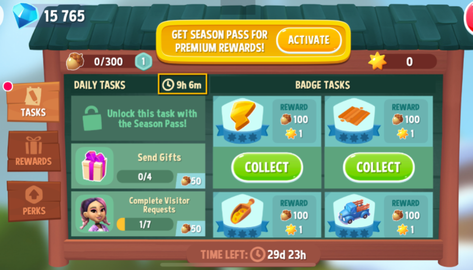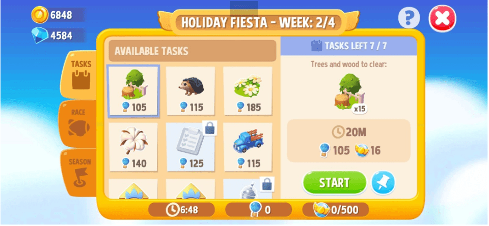- Country Camping (Season Pass) – FarmVille’s version of the Season Pass, where you perform specific tasks to earn points that unlocks rewards along the season pass reward track. Purchasing the premium pass gives access to perks like increased storage capacity, XP boosts, max energy caps etc.