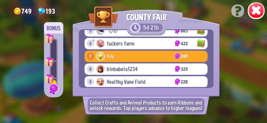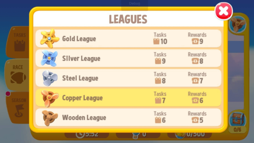 - County Fair – A weekly league leaderboard where players can move up or down leagues by earning leaderboard points from doing core loop activities.