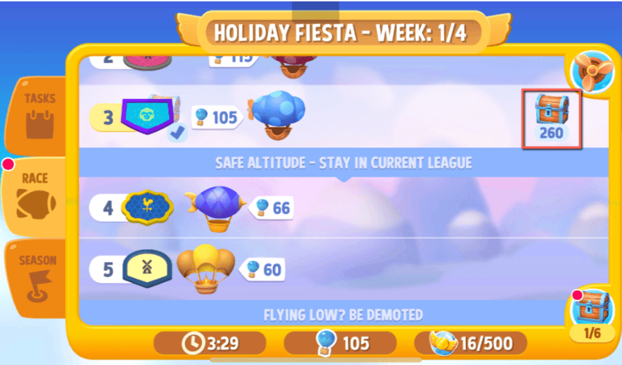 - Players can earn plenty of rewards from reaching milestones during the race, unlocking extra rewards by placing higher up the leagues and finally also purchase items from the Sky Race store with an event currency earned from doing tasks.