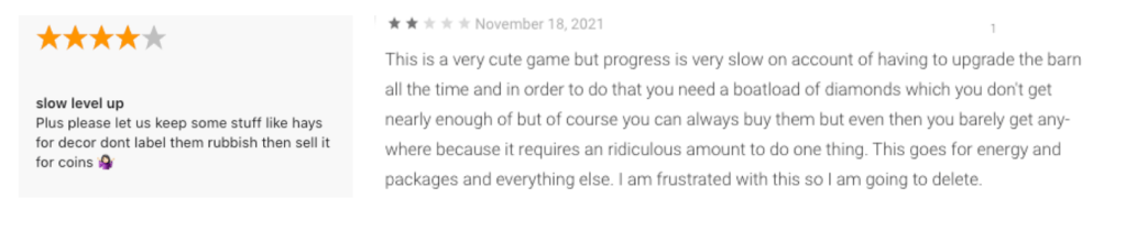 - Levelling up is slow because the only way to earn XP is from getting new animals, placing new buildings or from Farmhand activities, all of which that are heavily gated by energy, orders or currency limitations. Add this along with the fact that lot of the events and farmhands are gated behind levels = slow grind + repetition earlier in the game.