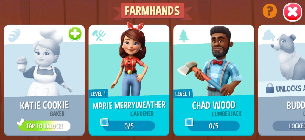 - Farmhands are unlocked with levels and can be upgraded by collecting their stickers.