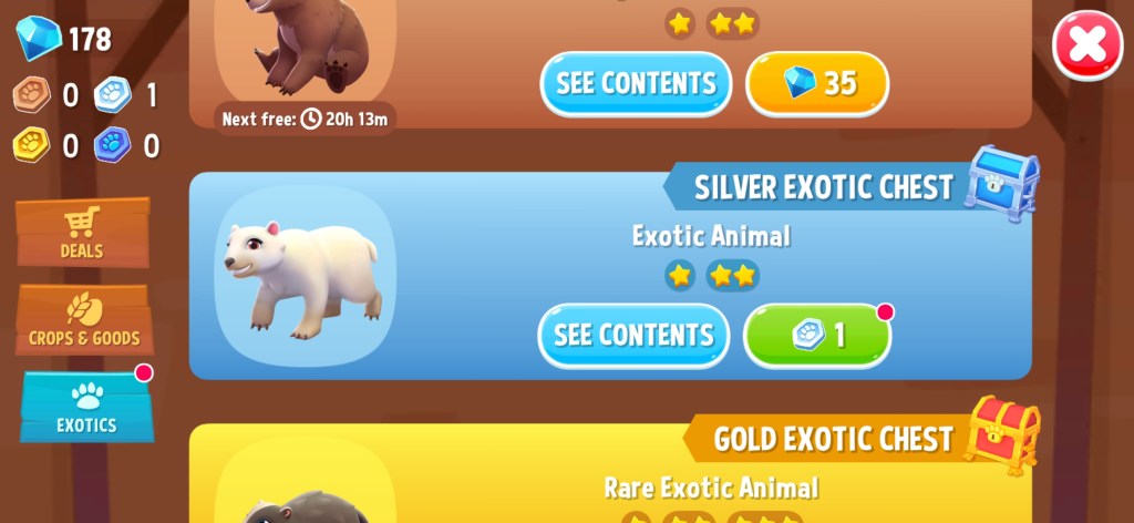 - When a baby becomes an adult, the parents become “elder” , basically this is where you have to sell them and send them to a sanctuary (A nice touch). This is basically the mechanic to cycle through animals since they are now perpetually unlocked through animal boxes. Elders are sold immediately for some coins.