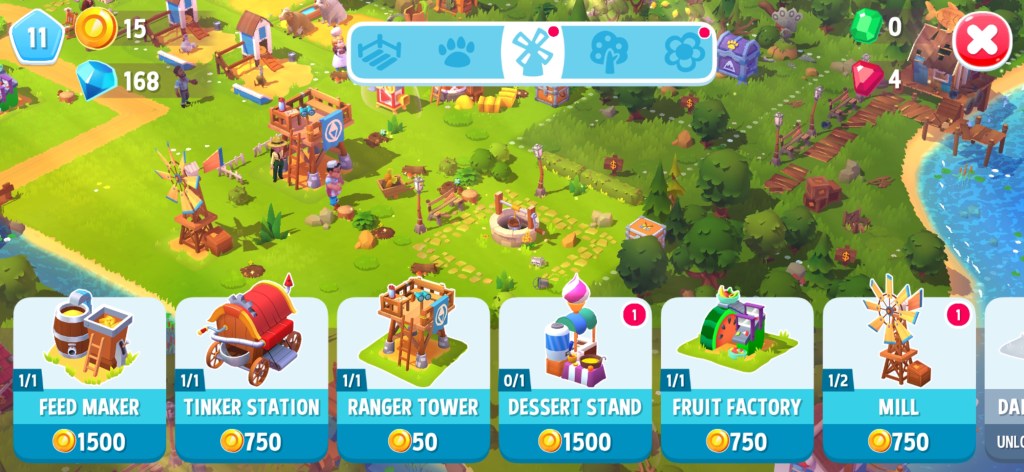 - Each building starts with 2 slots. Additional slots can be purchased with gems. Crafting here is sequential. Again, similar to most other farming games. You can have multiples of certain buildings as well.