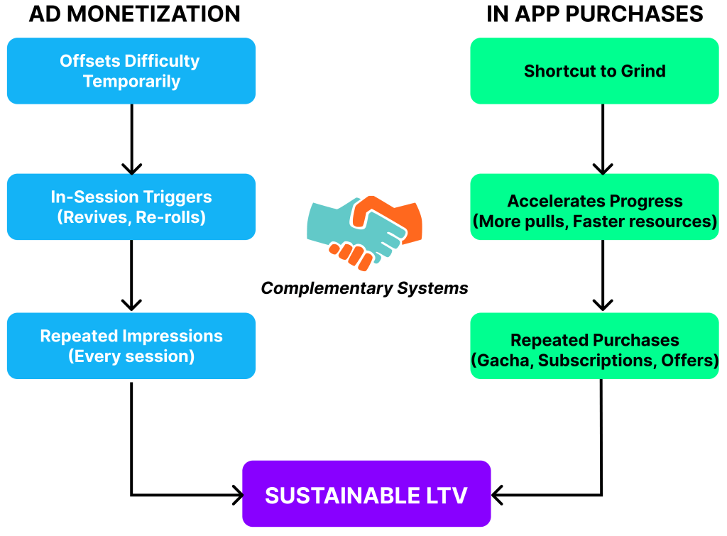 IAP and Ad monetization genuinely complement each other. The architecture of when and how each system is presented means they serve different player behaviors without cannibalizing each other. This is harder to achieve than it sounds.