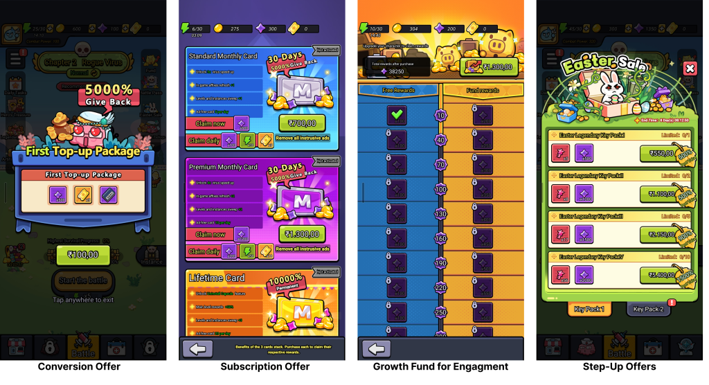 The IAP product suite is structured across three behavioral objectives, first conversion (low-barrier entry offers to get a player’s first purchase), repeat conversion (subscription products, gacha pulls, regular offers timed to events), and price step-up (escalating value offers that move players up the spending ladder). This is a thoughtful product architecture rather than a menu of items, and it reflects a clear understanding of payer lifecycle.