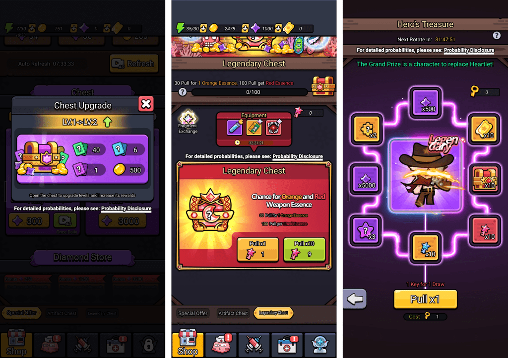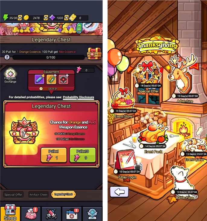 Daily liveops are focused on enhancing monetization through the gacha system. Legendary Chests and Artifact Chests refresh on a schedule, giving players regular new reasons to spend accumulated resources. This isn’t content — it’s a monetization cadence system that ensures the gacha sink stays active even between major events.
