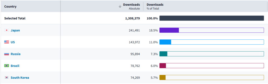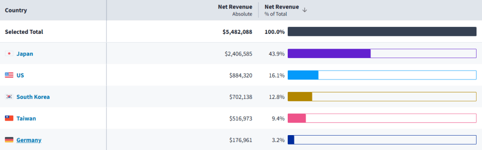 The US sits at 16.6% of revenue and 11.5% of downloads, which puts it roughly in parity, but meaningful because it confirms the game is finding traction in a market that wasn’t its primary target. Germany and the UK also feature, suggesting organic spread rather than a deliberate western push.