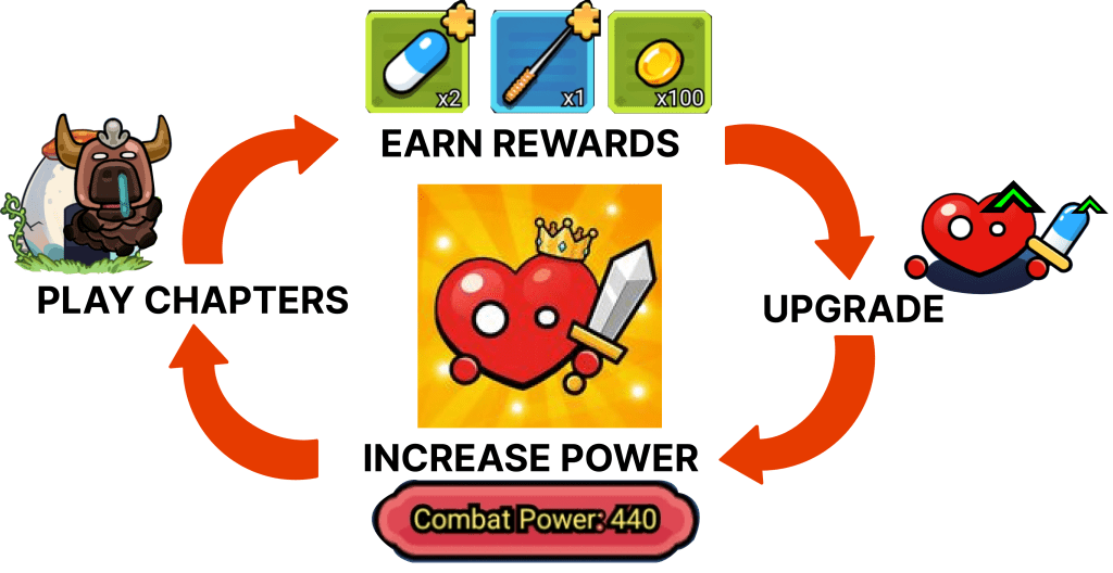 The player’s primary goal in Cell Survivor is to raise their Combat Power. Every action in the game, in-session and in the meta is oriented around this goal. There is no secondary aspiration competing for attention.