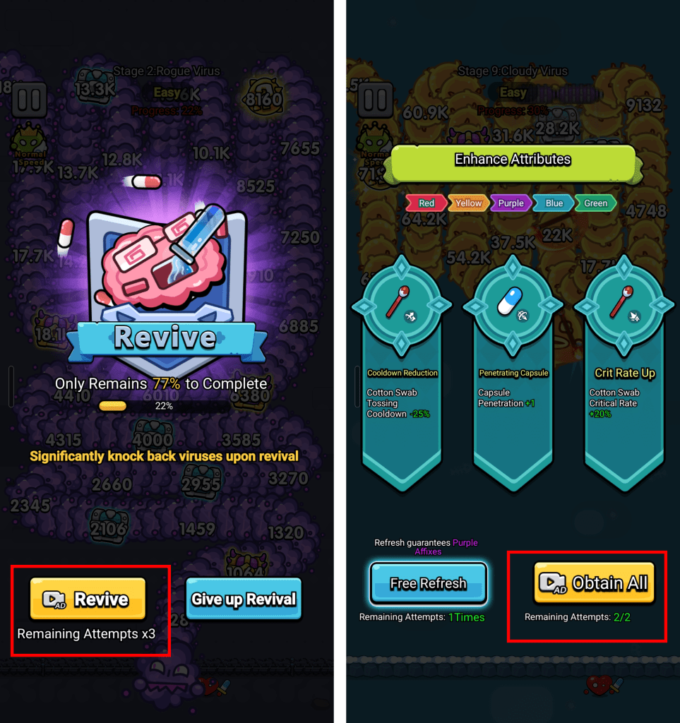 The monetization model in Cell Survivor is worth examining because it does something that many F2P games fail at, it makes IAP and ad monetization genuinely complementary rather than competing systems.