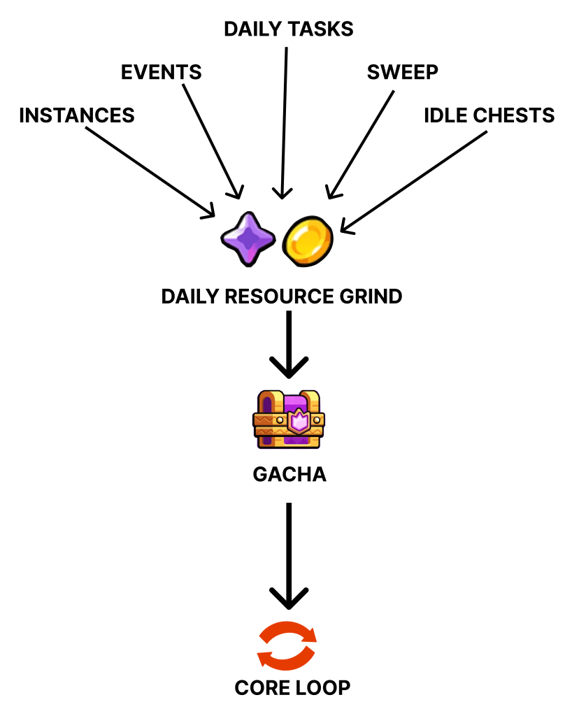 The architecture is straightforward, meta features exist to maximize daily resource generation, which in turn maximizes repeat gacha spend. What’s notable is how intentional the funnel is. Each one serves a purpose in the resource flow.