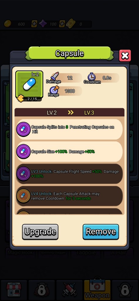 Weapon Upgrades serve a dual purpose. Upgrading weapons increases DPS in-session and critically, unlocks more choices when chests are ‘opened’. More weapons in your collection means more options during play. Weapon upgrades are done with shards but don’t cost anything, but require gems to acquire via gacha. The weapon deck system allows you to take the best combination of weapons into battle, influencing the choices your are given.