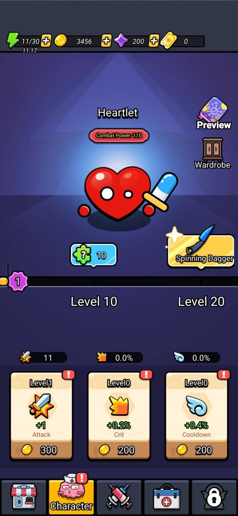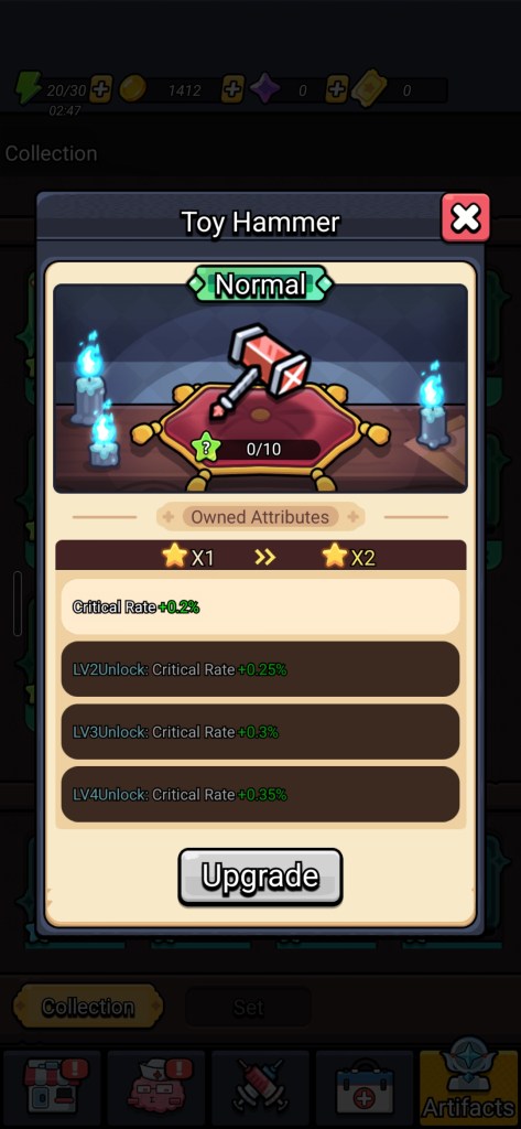 Primary power progression is too narrow. Character upgrades, which are the main driver of Combat Power, are limited primarily to Attack stat improvement and are gated behind coin accumulation. This creates a bottleneck that funnels all player attention toward a single resource and a single upgrade path at the expense of the weapon and artifact systems, which have considerably more spend depth but less pull as long as Attack is the dominant lever.